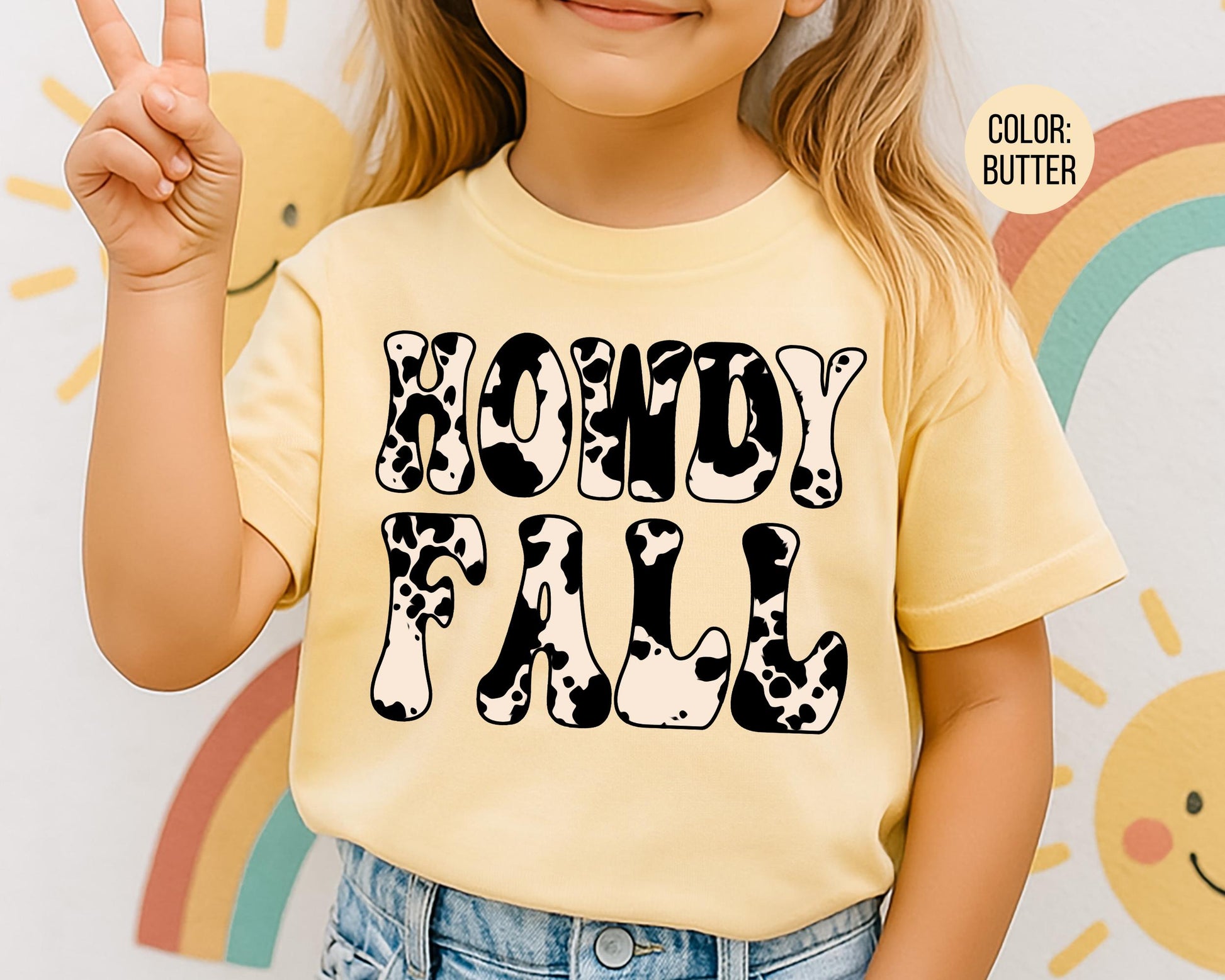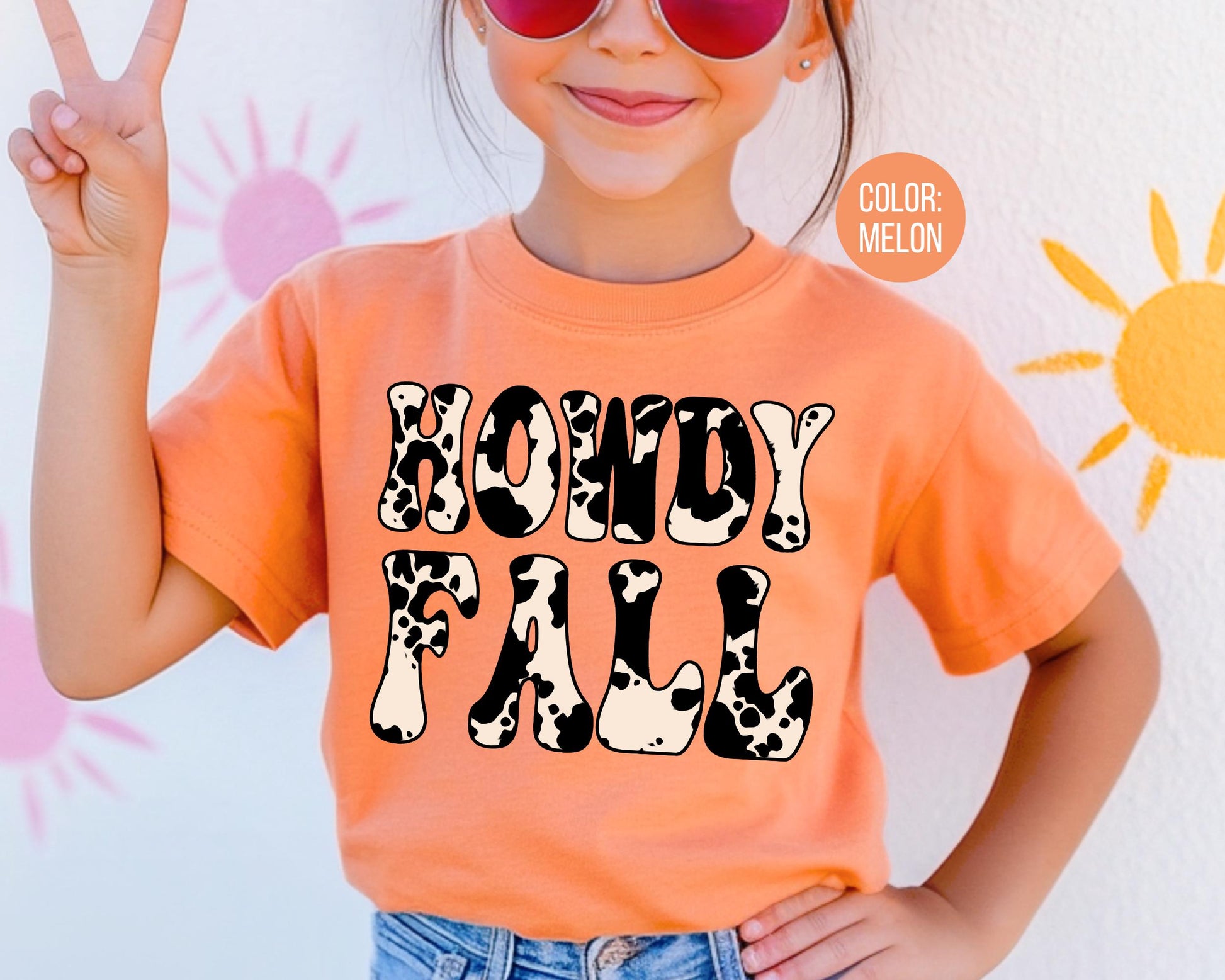 Comfort Colors Kids Howdy Fall Cow Print Shirt, Western Fall Shirts
